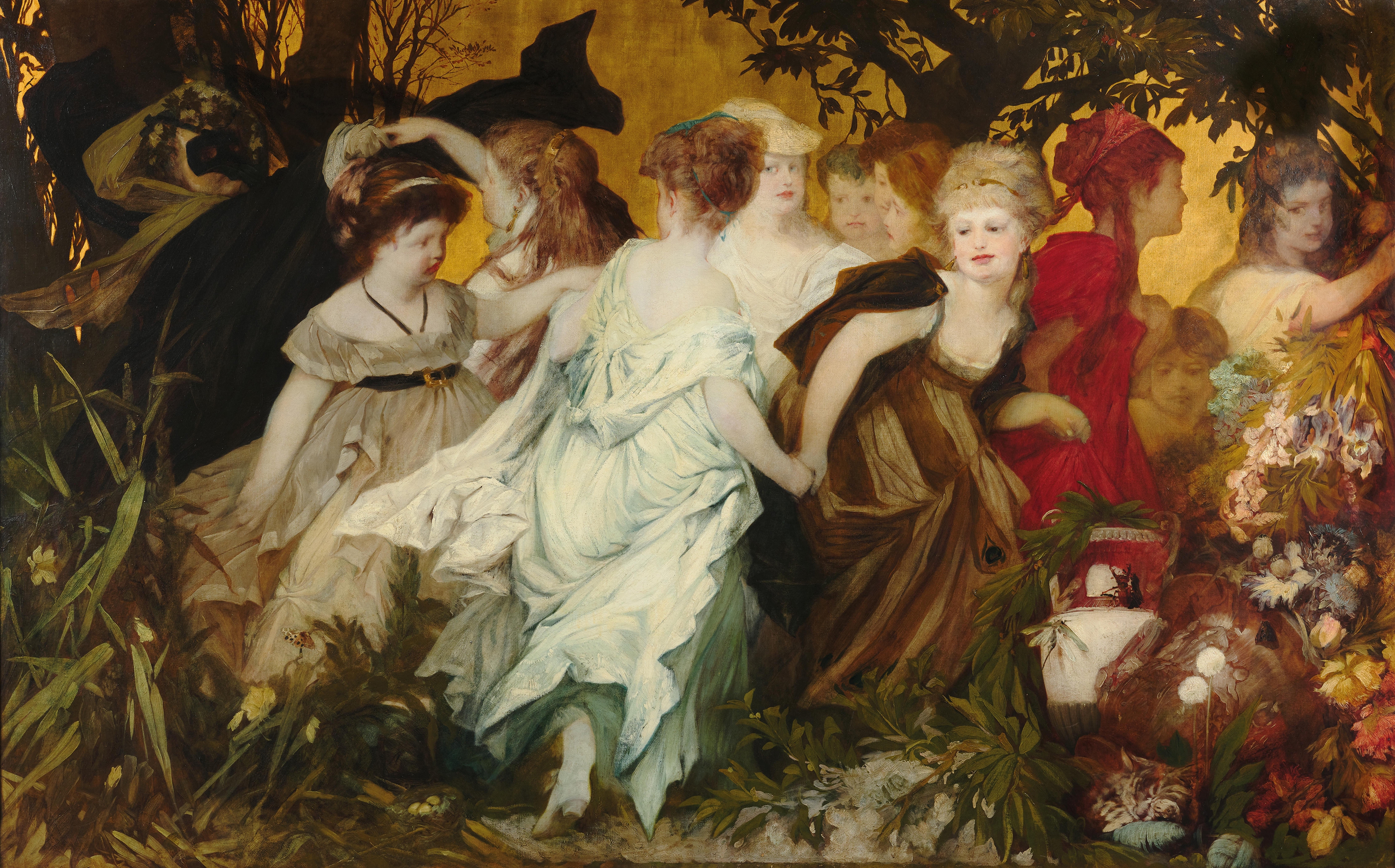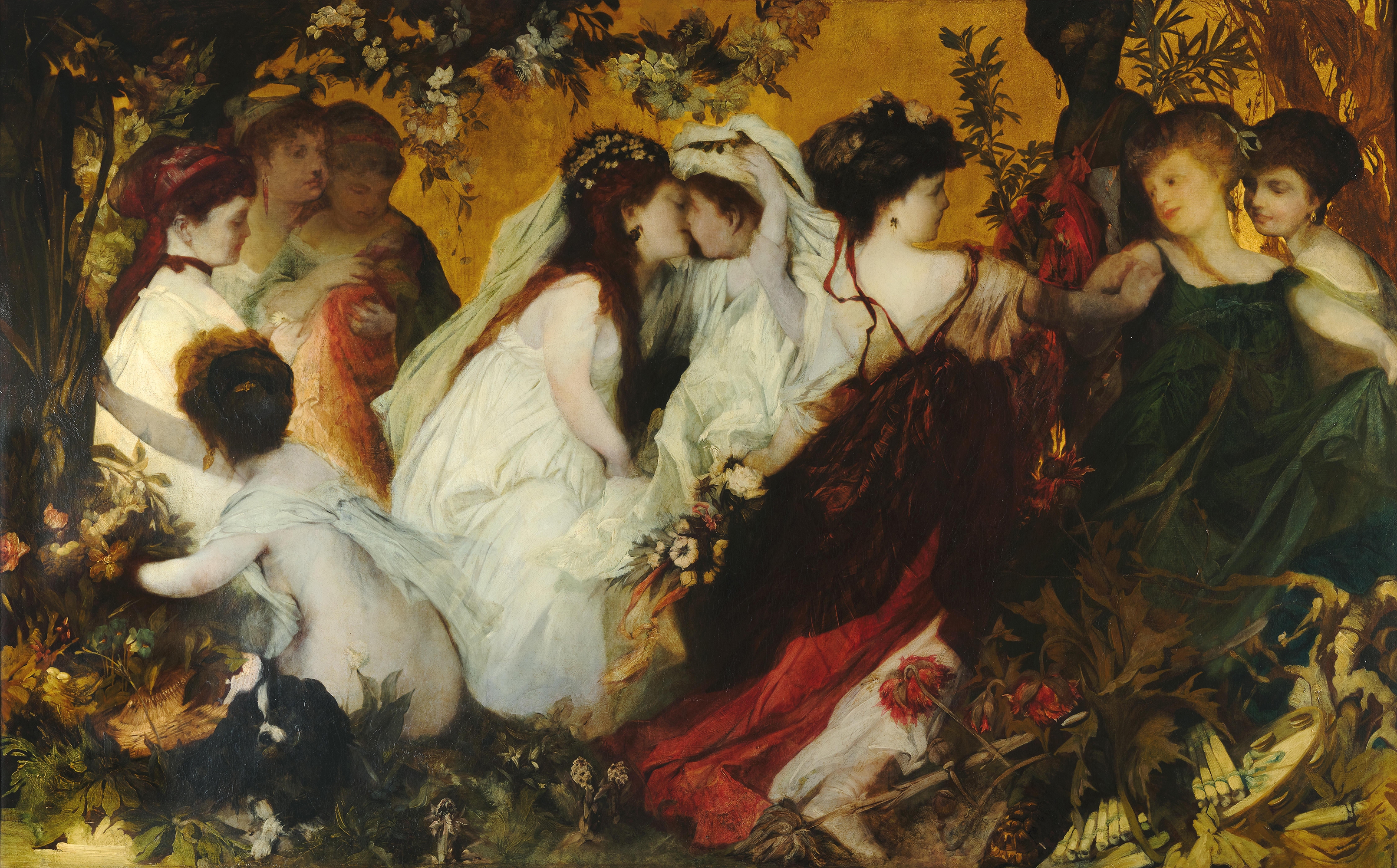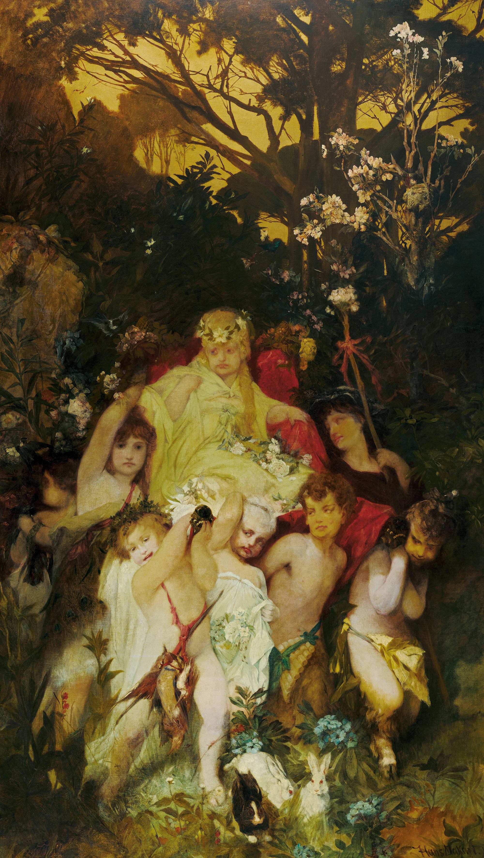 Hans Makart’s Modern Cupids from 1868, a triptych, was likewise conceived for architectural integration. The three-part painting depicts a festivity in an enchanted woodland setting; mythological beings revel, dance, and kiss. The “modern” aspect of the work, emphasized in its very title, provoked a scandal that would make Makart famous: the outwardly prudish bourgeois society of the time was unaccustomed to seeing cupids – those familiar companions of the god of love, Amor – portrayed as adolescent figures exploring their own sensuality.